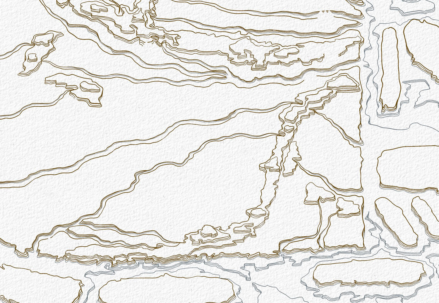 Aboutir à un résultat satisfaisant en matière de rendu graphique a nécessité d'importantes recherches. Mon dévolu s'est finalement jeté sur un traitement altimétrique, donnant aux cartes un effet de volume et un rendu contemporain. Le travail démarre donc ainsi : découper, trait par trait, chaque côte, chaque île, chaque détroit. Une altimétrie réalisée entièrement à la main, et qui demande souvent plusieurs journées de travail (puisqu'il faut, entre autres, vérifier, sur chaque manuscrit, que ce qui me semble être une montagne ou un lac, est bien une montagne ou un lac dans le texte : sur certaines cartes, la nature des objets dessinés est tout à fait déroutante, et la carte n'est pas toujours exactement cohérente avec texte du manuscrit. Donc, c'est très long !