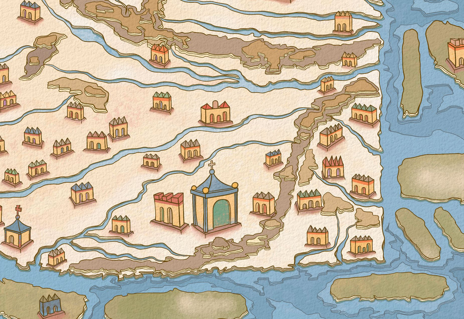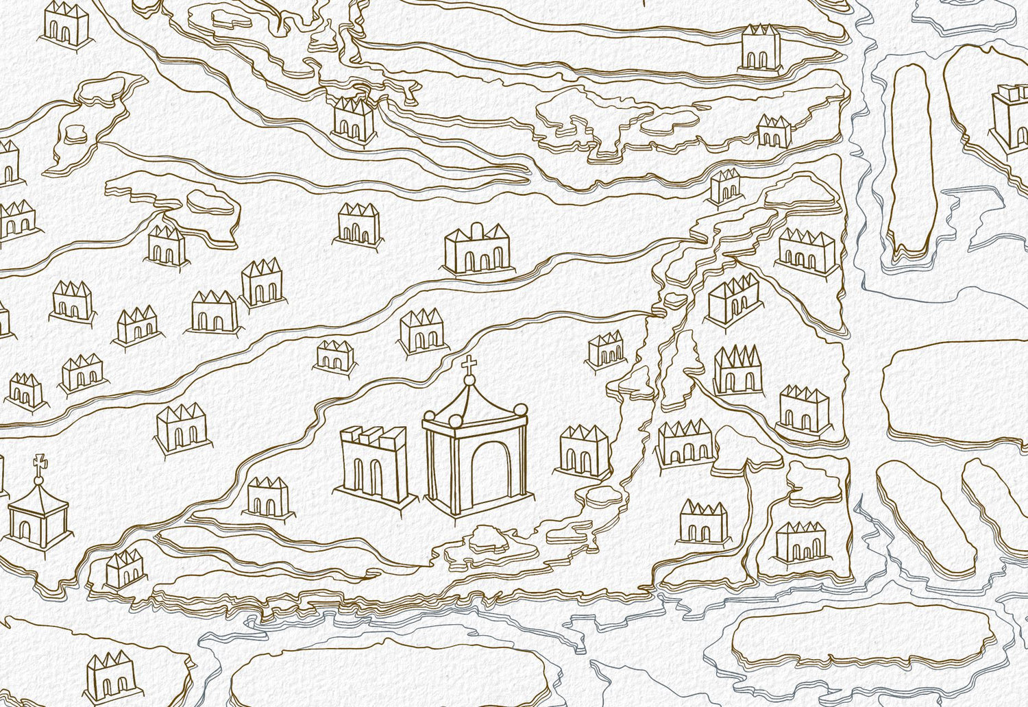Une carte illustrée, ce doit être une carte illustrée ! Ombres (qui ajoutent de la profondeur), herbes folles, fleurs, roches, chemins, arbres, animaux, de nombreux détails sont ajoutés à cette étape : ce sont des détails volontairement insignifiants : il ne doit pas y avoir de confusion entre ce qui relève du manuscrit original, et ce qui n'est que pure fantaisie. Ne reste plus qu'à passer à l'étape la plus longue de toutes (eh si !) : la mise en texte.