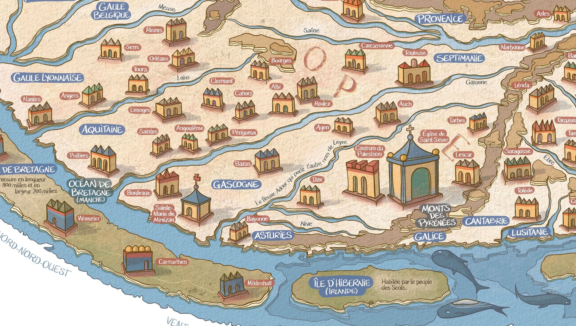 Nota bene : Une grande fidélité au manuscrit original a guidé la réalisation de cette version illustrée. L’ensemble des textes, toponymes, reliefs, commentaires et objets illustrés sont présents sur le manuscrit de Saint-Sever. Seule la topographie sous-marine est le fruit de l’imagination de l’auteur. Le Manuscrit original, en latin, est conservé à la Biliothèque Nationale de France. Il a été traduit par Emmanuelle Vagnon, docteure en histoire médiévale (CNRS), dans Le Beatus de Saint-Sever, facsimilé du manuscrit de la BnF, ms Latin 8878 et volume de commentaires, sous la direction de Charlotte Denoël, Paris, Citadelles/Mazenod, 2022, p. 40-67.